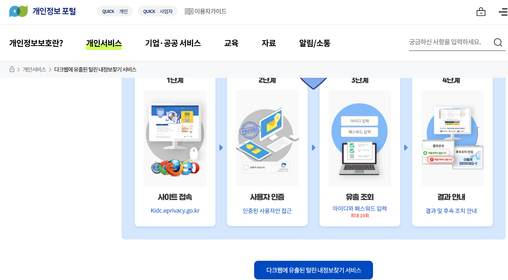 - **개인정보보호 포털 / 한국인터넷진흥원(KISA)**의 ‘털린 내 정보 찾기’