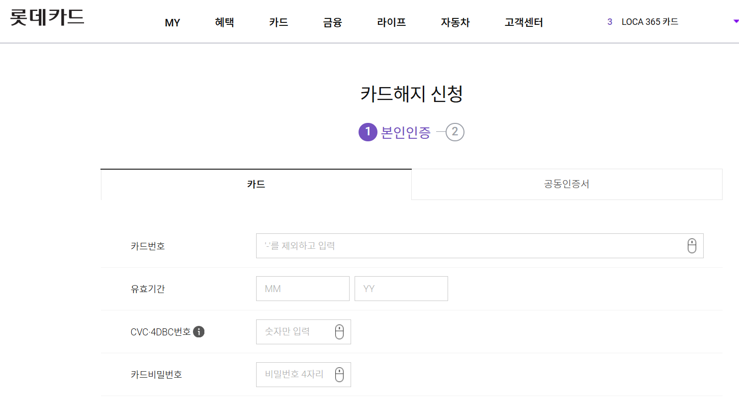 - 로그인 → 카드관리 메뉴 → 해지 신청 → 본인 인증