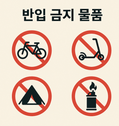 - 반려동물은 출입할 수 없으며(시각장애인 안내견 제외), 안전을 위해 킥보드·자전거도 반입 불가합니다.