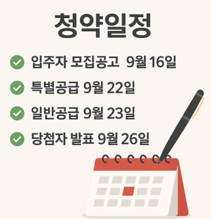 관심 있는 분들이라면 **청약일정(9월 16일~26일)**을 반드시 캘린더에 표시해 두시고, 자격 조건을 사전에 꼼꼼히 확인하시길 추천드립니다.