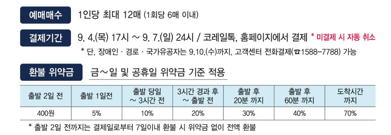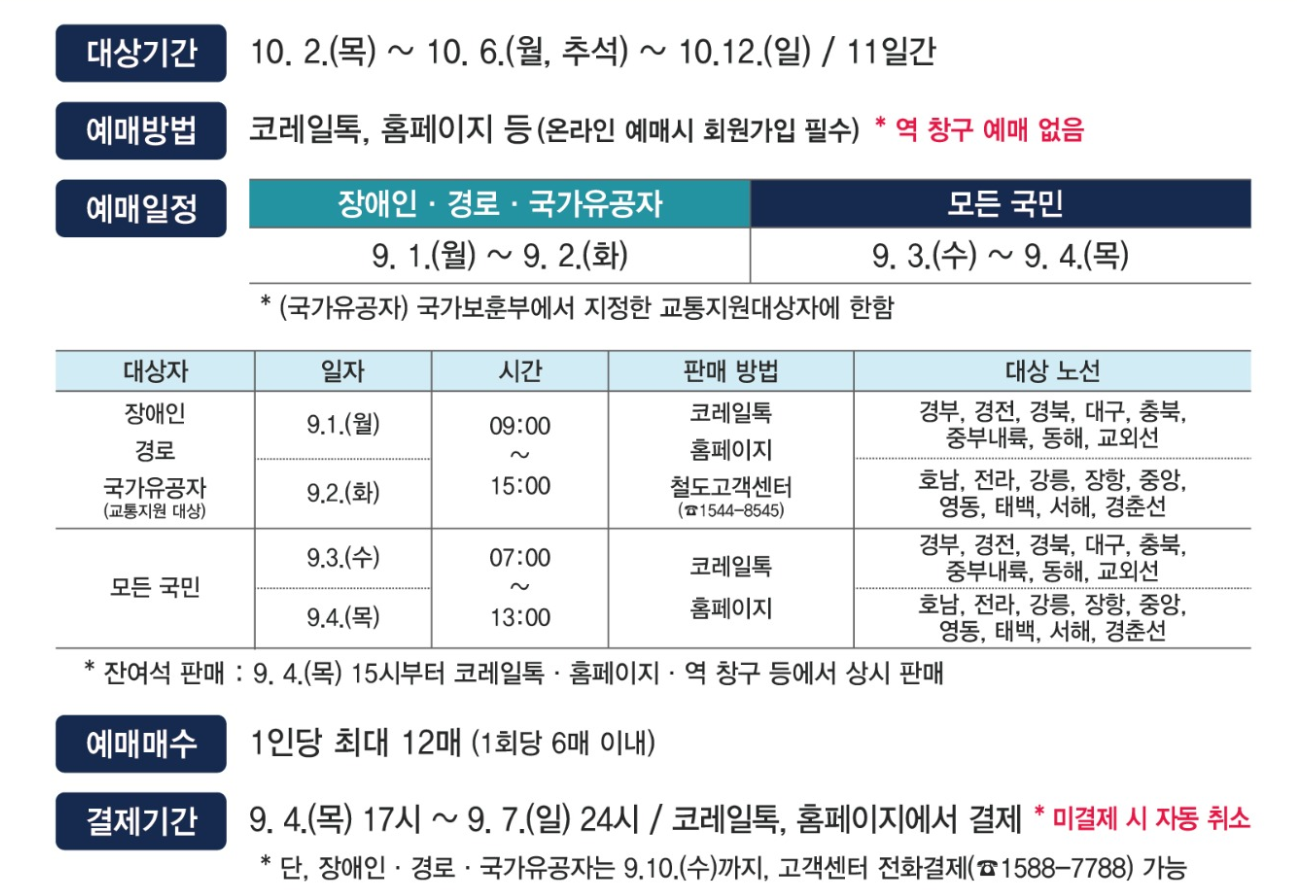 - 코레일은 반드시 **명절 전용 홈페이지(또는 앱)**을 통해 예매해야 하며, 접속 후 창을 벗어나거나 새로고침하면 대기 순서가 초기화됩니다.