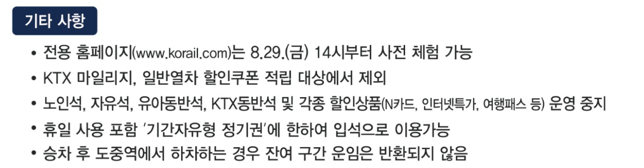 - 명절 승차권은 할인이나 마일리지 적립이 적용되지 않으며, 자유석이나 자전거석, N카드 혜택도 사용할 수 없습니다.