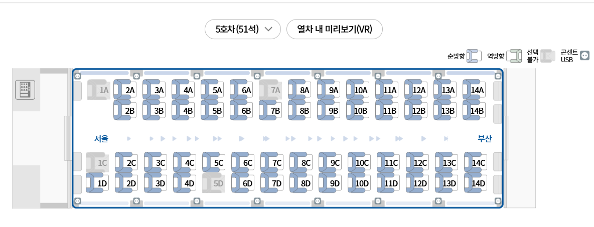 - KTX 5호차 : 과거 특실을 개조한 객차라 좌석 간격이 여유롭습니다. 특히 1A 좌석은 옆자리가 없어 혼자 이동 시 최고의 선택지입니다.