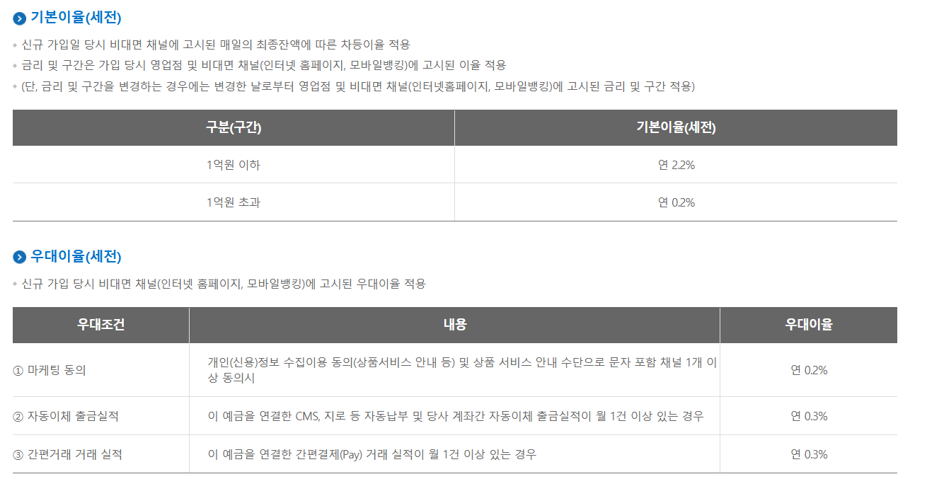 - 기본금리(세전): 1억 원 이하 2.2% / 1억 원 초과 0.2%